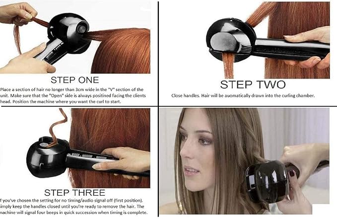 Professional Pro Perfect Ladies Curly Hair Machine Curl Secret Hair Curler Roller with Revolutionary Automatic Curling Technology For Women Girls Auto Rotating Steam Curler : The innovative rotating curl chamber emits negative ions and maximum far-infrared heat for fast, gentle curling without damaging the hair. The steam helps seal moisture for gorgeous, beach waves. The titanium, combined with the heating system, also enhances its durability and heat transfer, unlike conventional ceramic curling irons and wands. Features : Nano-atomization technology 3 timer settings for different curl effects 3 heat setting up to 230℃ for long lasting results Powerful heating system ready to use in seconds with ultra-fast heat recovery Curl direction control for either a uniform or natural finish Suitable for all hair length and types Salon length swivel cord Specification : Rated Voltage: 100-240V Rated Power: 29W Temperature setting:(230℃ is recommend) 190℃- for delicate, fine or colored hair 210℃- for normal textured hair 230℃- for thick or wavy hair How to use : 1. Place section of hair in unit where you want curl to begin. 2. Close handles, hair will be automatically drawn into the curl chamber. 3. Hold until a steady beep signals curl is ready. Open to release the perfect curl. Package included : 1 x Perfect Hair Curler