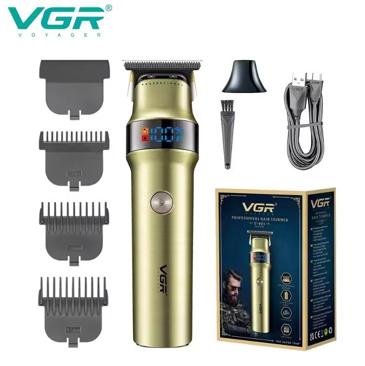 The VGR V-991 Professional Hair Trimmer in gold is a powerful grooming tool designed for both salon and home use. Featuring a ceramic and stainless steel blade, this trimmer ensures a smooth and precise cut. It boasts a 2000mAh lithium battery with a 3.5-hour charging time, offering an impressive 400 minutes of runtime. The trimmer operates with a 7000 RPM DC motor and includes a turbo function for enhanced performance. The LED display keeps you informed about battery levels, while the travel lock ensures safe storage. With three guide combs (1.5mm, 3mm, 4.5mm) and an oil bottle for regular maintenance, this trimmer is the perfect solution for effortless, professional grooming.